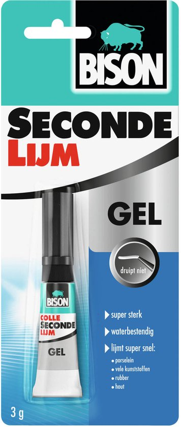 De Bison Secondenlijm Gel 3g is een hoogwaardige secondelijm in gelvorm die perfect op zijn plaats blijft en niet uitloopt. Deze lijm is ideaal voor verticale oppervlakken en poreuze materialen, en biedt gecontroleerde verlijming met een korte corrigeertijd.