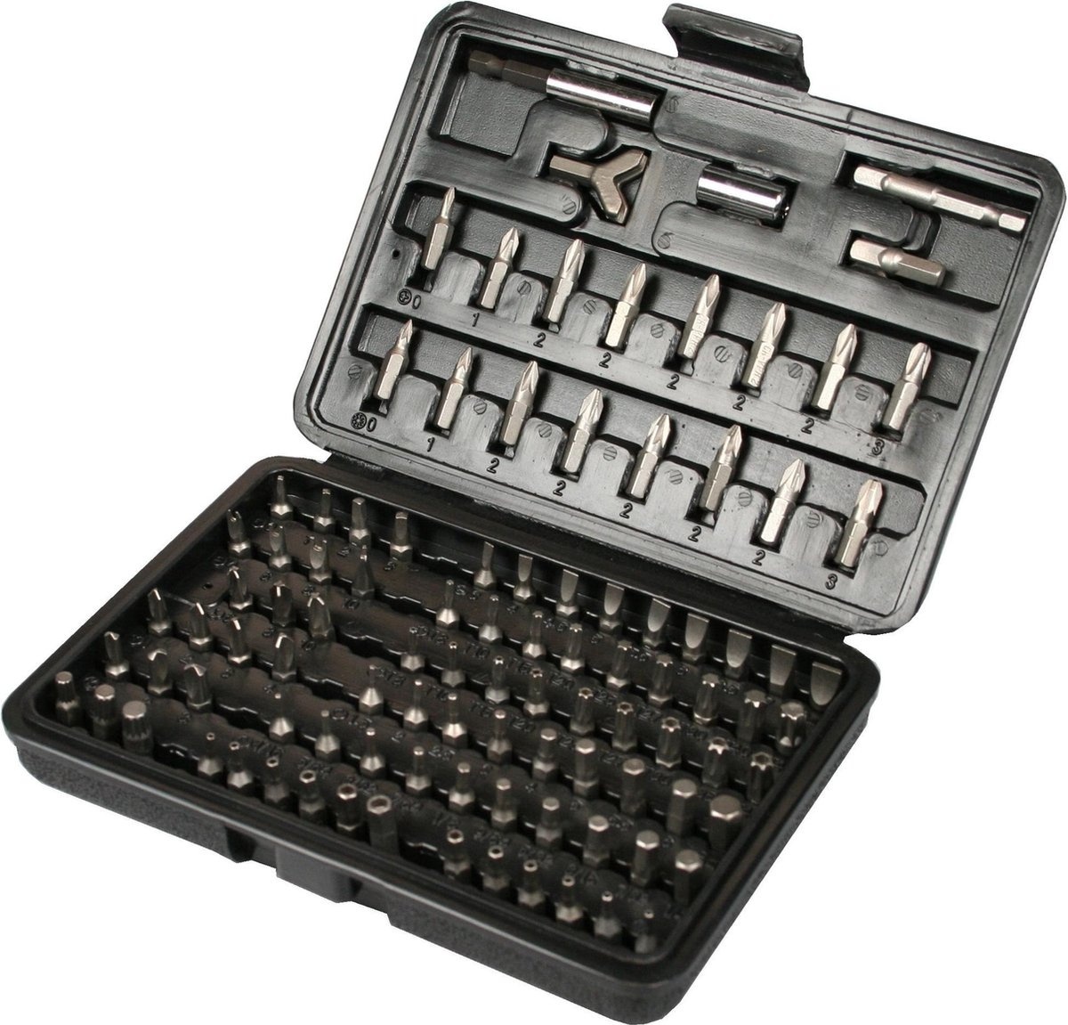 • Uitgebreide bit set in stevige kunststof opberg box