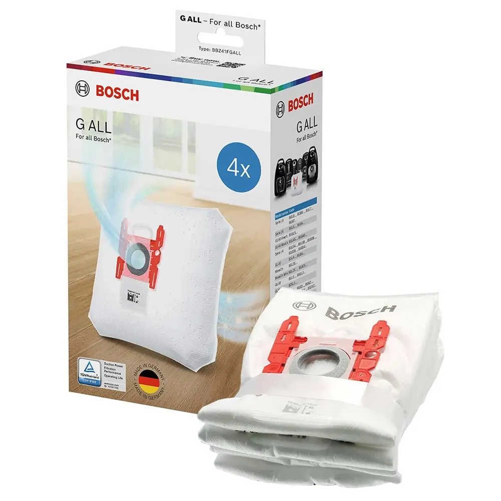 De Bosch Stofzuigerzakken Type G All (artikelnummer BBZ41FGALL) zijn speciaal ontworpen voor alle Type G modellen. Deze verpakking bevat 4 zakken en biedt 99,9% filtratie met 60% meer zuigvermogen, waardoor je huis optimaal schoon blijft.