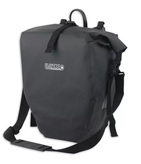 De zwarte enkele fietstas Rocky van Lynx is een hoogwaardig afgewerkte tas, gemaakt van 100% waterdicht tarpaulin. Dit sterke egale materiaal zorgt voor een strak design, maar maakt de tas ook krachtig. De tas heeft namelijk een inhoud van maar liefst 29 liter. De fietstas heeft een rolsluiting en kan met 3 klikgespen gesloten worden. Aan de verharde achterzijde van de tas zitten verschuifbare bevestigingshaken voor de bagagedrager. Door middel van het quick-mount systeem klik je de tas makkelijk op een bagagedrager met een buisdikte van Ø 8 tot 15 mm. Met het slimme trek handvat pak je de tas weer makkelijk van de drager, om hem vervolgens eenvoudig mee te nemen door de standaard meegeleverd schouderband. Voor een goede zichtbaarheid heeft de fietstas aan twee zijden reflecterende elementen.
