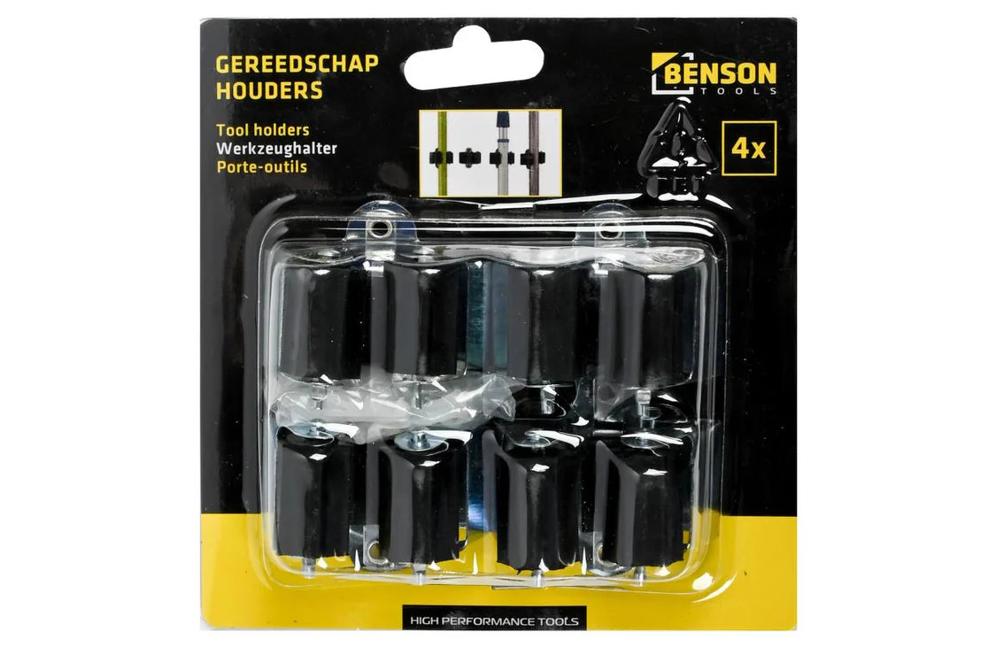 Gereedschaphouders 4-delig — set van 4 houders voor het veilig en overzichtelijk ophangen van gereedschap, huishoudelijke en tuingereedschappen. Inclusief bevestigingsmateriaal.