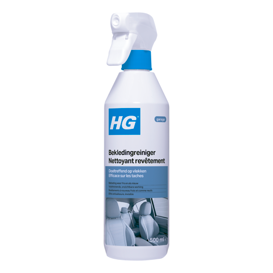 Door intensief gebruik wordt de bekleding van de auto, boot of caravan snel vies. Ook vlekken die het gevolg zijn van morsen van eten en drinken, vervuilen de bekleding van caravan, boot of auto. Onze bekledingreiniger auto biedt gelukkig uitkomst. Om verergering of uitbleken te voorkomen, is het belangrijk te kiezen voor een speciaal ontwikkelde bekleding reiniger voor het verwijderen van vlekken en het reinigen van vervuilde bekleding. De HG bekledingreiniger heeft na gebruik ook een onzichtbare vuilafstotende werking, waardoor er minder snel opnieuw vlekken in de bekleding komen.