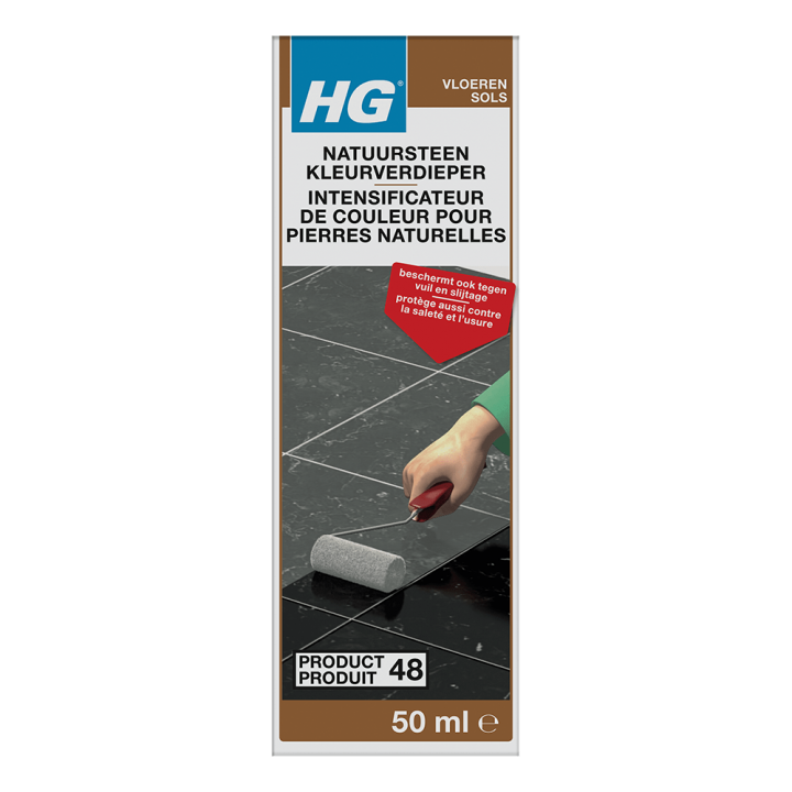 HG kleurverdieper voor graniet en ander natuursteen (product 48) is een product op professionele basis dat de kleur van graniet en ander natuursteen verdiept en zo weer tot leven brengt. Bovendien voedt en beschermt deze kleurverdieper het natuursteen tegen vuil en vlekken als gevolg van water of andere vloeistoffen.