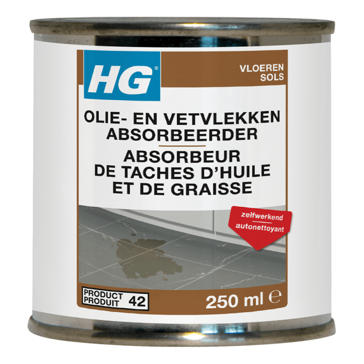 HG olie- & vetvlekken absorbeerder (product 42) is een product dat gemakkelijk vrijwel alle soorten hardnekkige olievlekken en vetvlekken uit alle poreuze steenachtige ondergronden verwijdert.