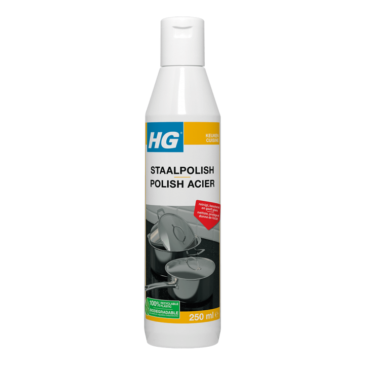 HG staalpolish reinigt, glanst en beschermt. Door de beschermende werking wordt een snelle hervervuiling voorkomen en de polijstende werking van de staalpolish, zorgt voor een mooi glanzend effect. Daarnaast is de RVS polish ook nog eens zacht voor de huid. De HG staalpolish is het ideale onderhoudsmiddel voor:
