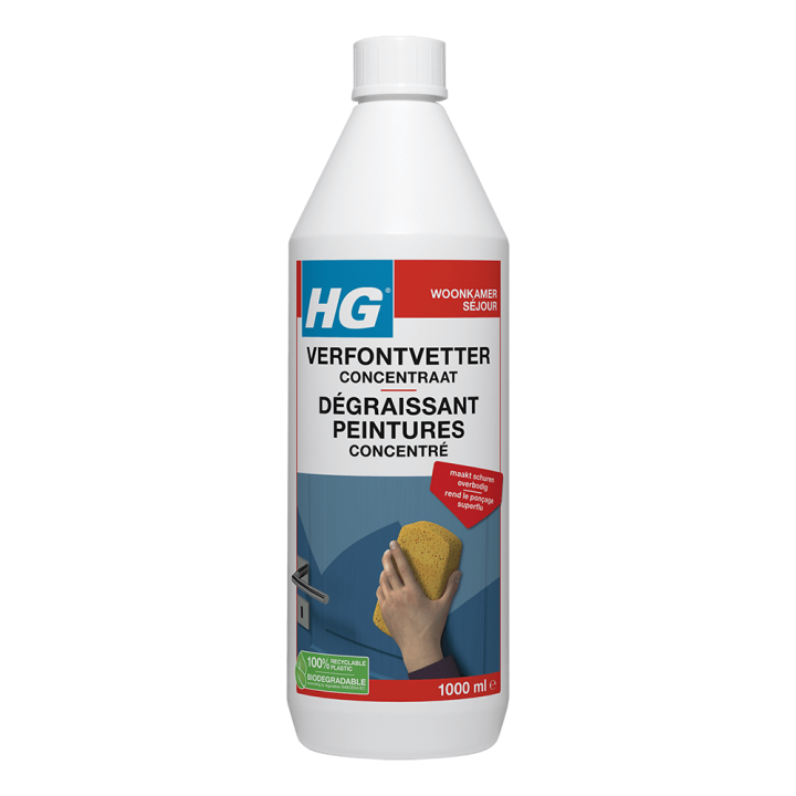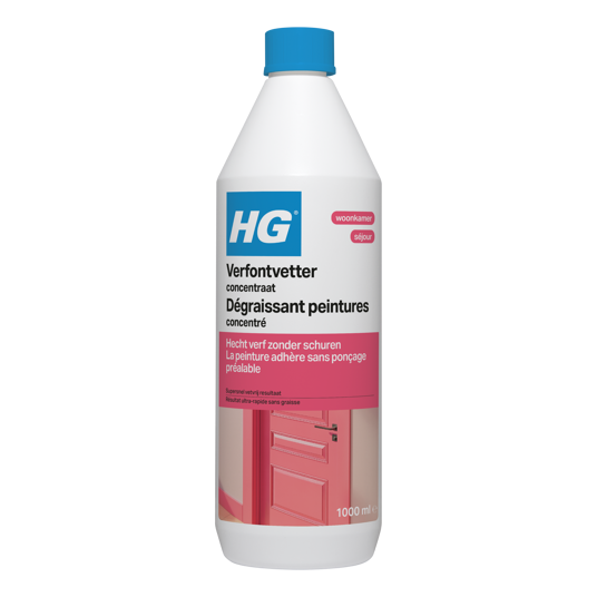 HG verfontvetter concentraat maakt als verf ontvetter verfwerk en onbehandelde oppervlakken die nog geschilderd moeten worden, super schoon en vetvrij, Hierdoor is schuren niet meer nodig en kan er direct met schilderen worden begonnen.