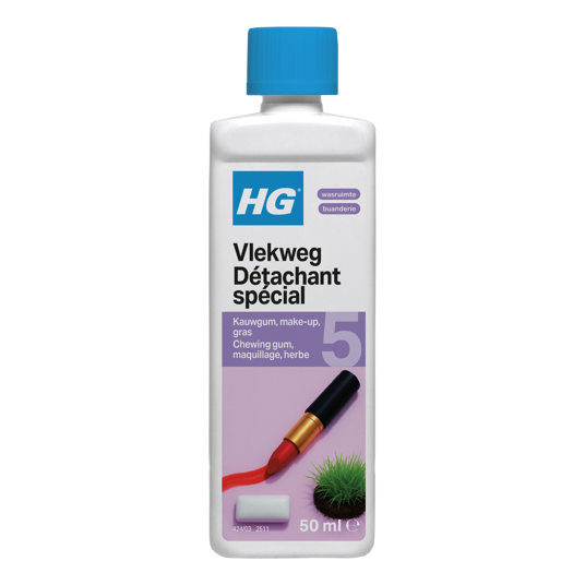 HG vlekweg 5 verwijdert vlekken uit textiel van make-up, gras, stuifmeel, markeerstift, kauwgom maar ook van mascara, waterverf, aarde, klei, bouwzand en gravel. HG vlekweg 5 is één van onze 7 speciale HG vlekken verwijderaar producten.