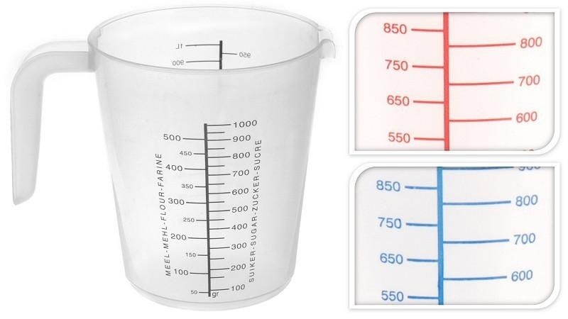 Deze maatbeker heeft een capaciteit van 1 liter en is voorzien van verschillende maataanduidingen voor meel, suiker en water. Verkrijgbaar met opdruk in blauwe, rode en zwarte kleuren. Let op: de maatbeker is niet vaatwasmachinebestendig.