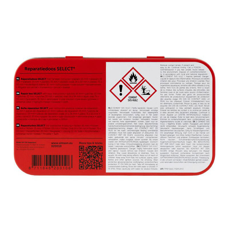 De Simson Reparatiedoos Select is een handige en complete reparatiedoos voor het repareren van vrijwel iedere fietsband. Volg bij het plakken van de band de bijgeleverde instructies. De inhoud van de Simson reparatiedoos Select is goed voor 16plakbeurten en bestaat uit: 3 x plakker 16mm, 3 x plakker 22 mm, 2 x plakker 25 mm, 2 x plakker 33mm, 2 x plakker ovaal, 1 x knippleister, 1 x buitenband plakker 35mm, 1 x waterproof schuurpapier,1 x tube solutie 10 ml, 3 x bandenlichter, 1 x universeel ventiel, 1 x markeerkrijt, 1 x pincet, 1 x doekje handcleaner