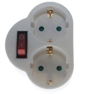 Stekkeradapter 2-voudig met randaarde + schakelaar met controlelampjeAdapter dubbel om op 1 stopcontact 2 randaarde stekkers aan te sluiten