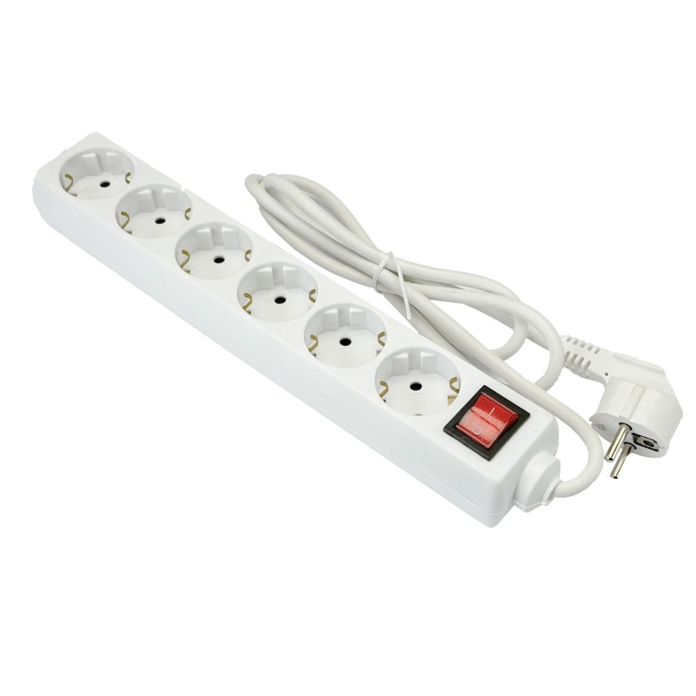 Stekkerdoos, 6-voudig, tafelcontactdoos, 3 meter snoer, randaarde, 2500 watt, wit, schakelaar, controlelampje.