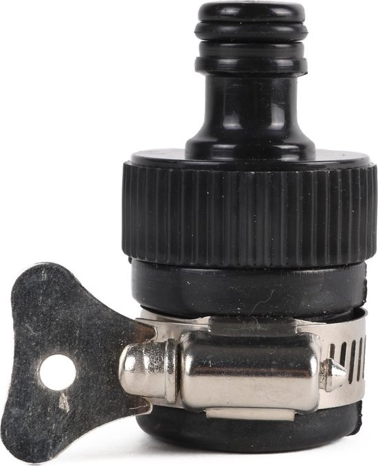 You use this tap connection with clamp to connect garden hoses to taps without a screw thread.