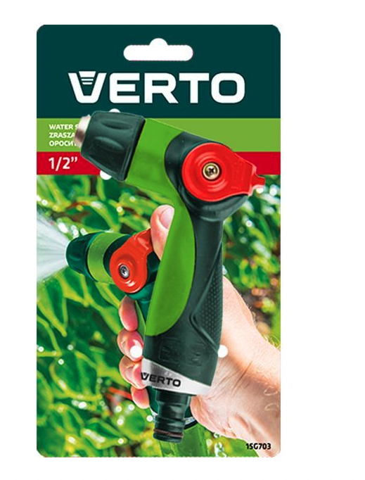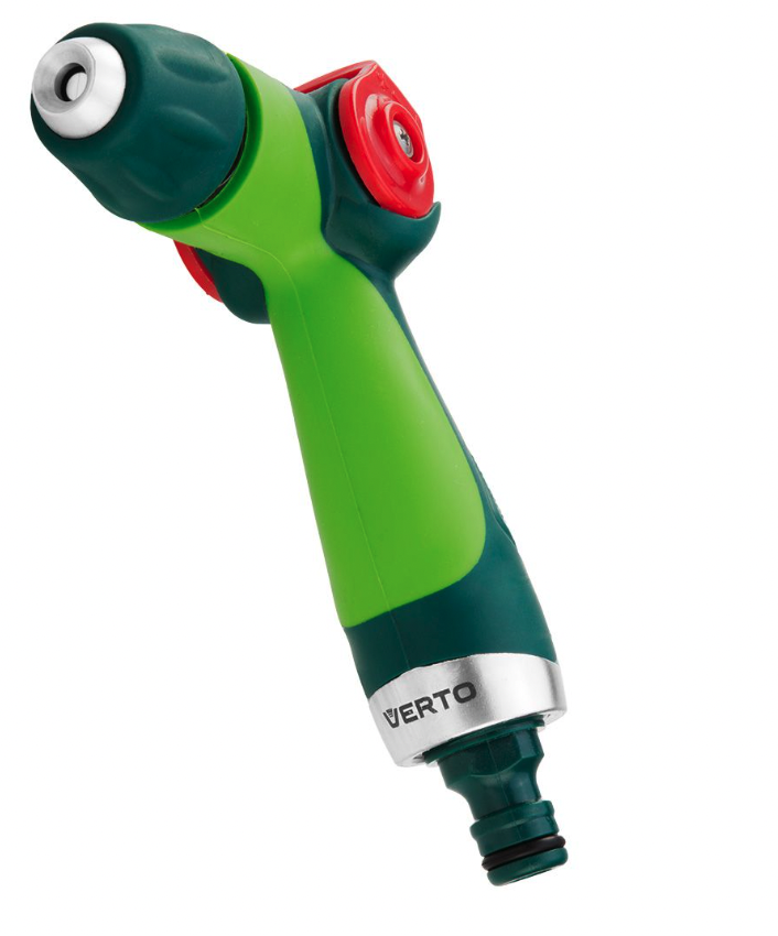 De VERTO Duimbediening Verstelbare Sproeikop (15G703) maakt het bewateren van gazons, bloembedden, tuinen en gewassen eenvoudig en efficiënt. Dit hoogwaardige slangmondstuk is uitgerust met een traploze regeling van de waterstroom, waarmee u moeiteloos kunt schakelen tussen verschillende besproeiingsniveaus, afhankelijk van de behoeften van uw planten. De handige duimbediening zorgt voor een snelle en moeiteloze aanpassing van de waterstroom, terwijl de vergrendelbare trekker continu gebruik mogelijk maakt zonder vermoeidheid. Het ergonomisch gevormde handvat, bekleed met antisliprubber, biedt een comfortabele en stevige grip, zelfs in natte omstandigheden. Dit veelzijdige mondstuk is ontworpen om vele seizoenen mee te gaan en is een onmisbare aanvulling op uw tuingereedschap.